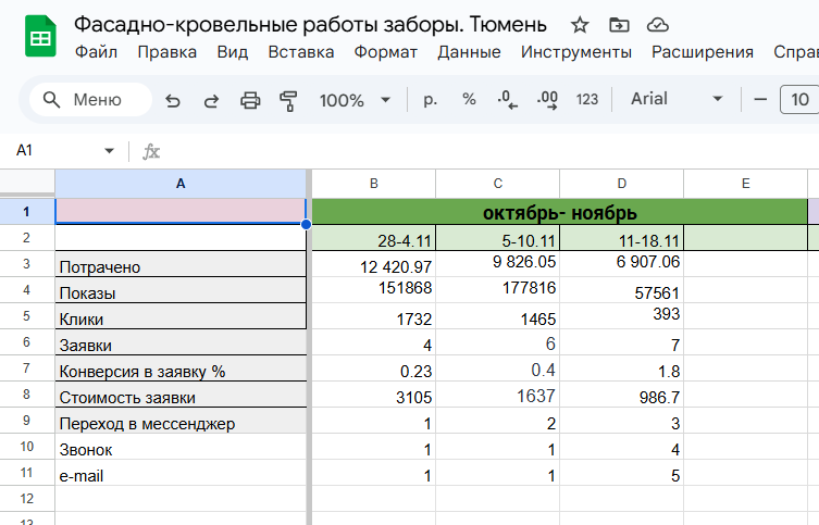 Клиент хотел протестировать нишу кровельных и фасадных материалов в Яндекс Директ в Тюмени, причем в самый неудачный для спроса сезон: октябрь–ноябрь.
